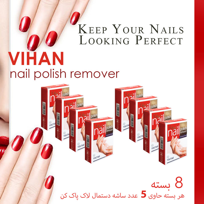 شما مصرف کننده عزیز و گرامی با خرید این مجموعه تعداد 8 بسته 5 عددی (40 عدد ساشه بزرگ 10×10) دستمال لاک پاک کن ویهان را دریافت می نمایید. دستمال لاک پاک کن ویهان (5 عددی) بسیار سریع ناخن را از هرگونه رنگ، رسوبات و حتی رنگ گوشه های ناخن تمیز می نماید. این پد لاک پاک کن، مخصوص ناخنهای شکننده و حساس طراحی شده است زیرا حاوی ویتامین E و است که سبب میشود لاکها به آرامی بدون اثر مخرب از روی سطح ناخن پاک شوند. ویتامین E به کار برده شده در این محصول مانع از خشک شدن پوست اطراف ناخن ها شده و پوست را نرم و لطیف می سازد. دستمال لاک پاک کن ویهان (5 عددی) به علت نداشتن اَستن، پارابن، الکل و اتیل استات و داشتن ویتامین ها باعث افزایش استحکام ناخن ها می شود و همچنین حساسیتی برای پوست دست ایجاد نمی کند. به دلیل غنی بودن از مواد موثره و تقویت ناخن شامل پروپلین کربنات، اتیل لاکتات، گلیسیرین، ویتامین E، ویتامین و اسانس مجاز آرایشی بهداشتی به خانم هایی که عادت مستمر به استفاده از لاک ناخن دارند توصیه میشود.
