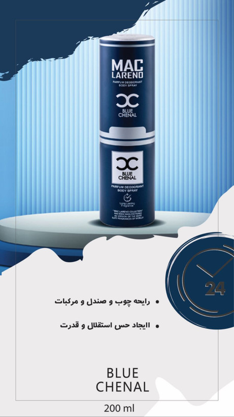 اسپری بدن مردانه مک لارنو مدل Bleu de Chanel حجم 200 میلی لیتر مشخصات فنی محصول: ** مشخصات ** حجم: 200 میلیلیتر نوع رایحه: خنک ماندگاری: 24 ساعت سایر توضیحات: اسپری ضد تعریق غیر پودری رایحه ابتدایی : گریپ فروت (Grapefruit) ، لیمو (Lemon) ، پرتقال (Orange) ، نعناع (Mint) ، جوز (Nutmeg) ، فلفل قرمز (Pink Pepper) رایحه میانی : گل یاس (Jasmine) ، زنجبیل (Ginger) ، درخت سدر (Cedar) ، درخت خس خس (Vetiver) رایحه پایانی : رزین لبدانوم (Labdanum) ، رزین کندر هندی (Olibanum) ، درخت پچولی (Patchouli) ، چوب صندل (Sandalwood)